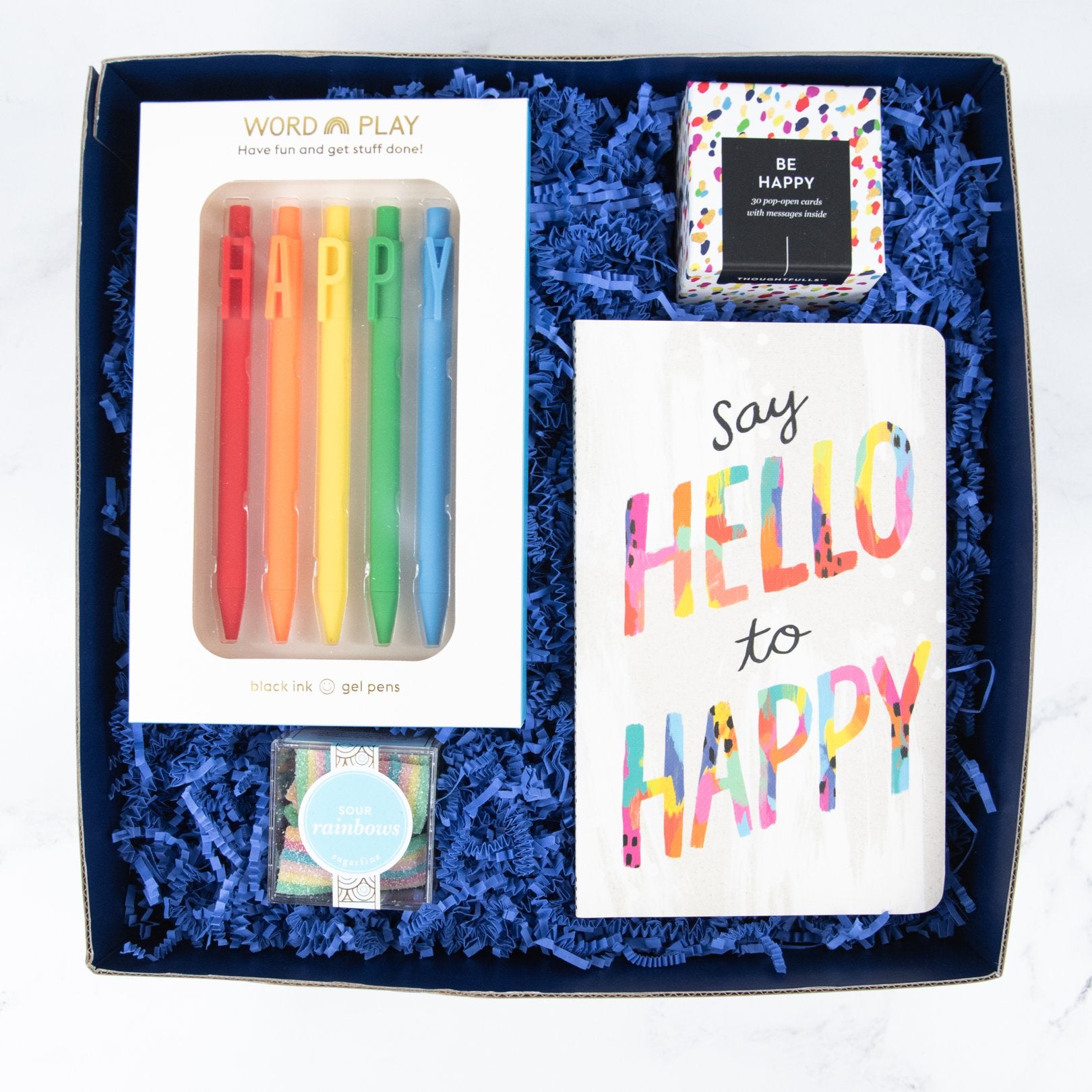Personalized Insulated Water Tumbler with Straw Lid, "So Happy You're Here" Notebook, 5-Pk "Happy" Word Play Pens, "Welcome" Gift Box with Branding Option Available