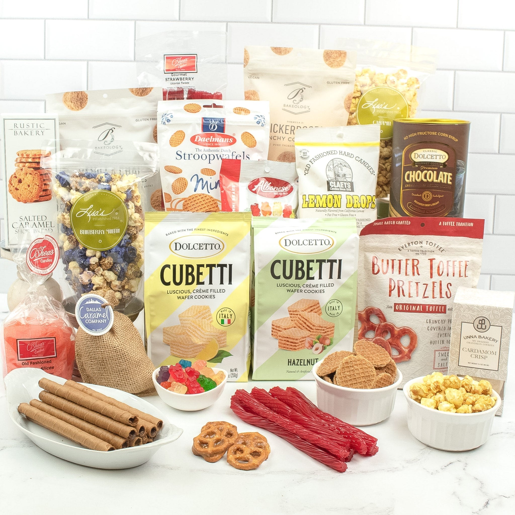 In addition to the caramels and gummy bears, you’ll find a large variety of decadent gourmet cookies in flavors that range from hazelnut or lemon wafers to a variety of rich, buttery shortbread. But we didn’t stop there—this gift also includes, chewy licorice, sweet and tangy orange slices, and a delightful mix of popcorns.