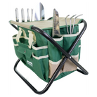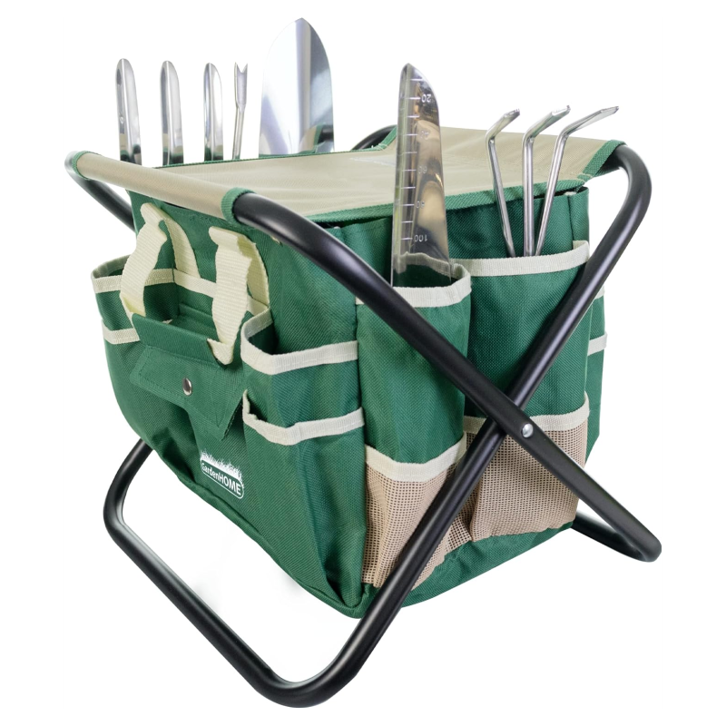 7 piece garden tool kit includes weeding fork,cultivator,weeder,transplanter,trowel,folding stool, tool bag. With a multi-compartment tote, it works great to hold different kinds of hand tools and gardening necessities.Designed to serve the purpose of portability and durability under all weather conditions. Our garden tool set is perfect for families and gardening enthusiasts.