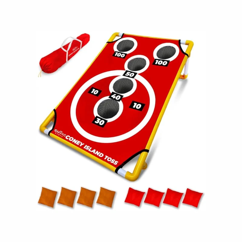 BOARDWALK STYLE CORNHOLE - The Coney Island Classic reimagined with everyone’s favorite tossing game. Bring nostalgia to your backyard with a beanbag toss twist. The scoring is the same, but now you get to test your tossing skills. Kids & adults will love the high-scoring gameplay with multiple holes, bouncing, & bean bag-knocking fun. Designed for all ages and skill levels, the whole family will battle to be crowned the Coney Island Toss champ!