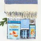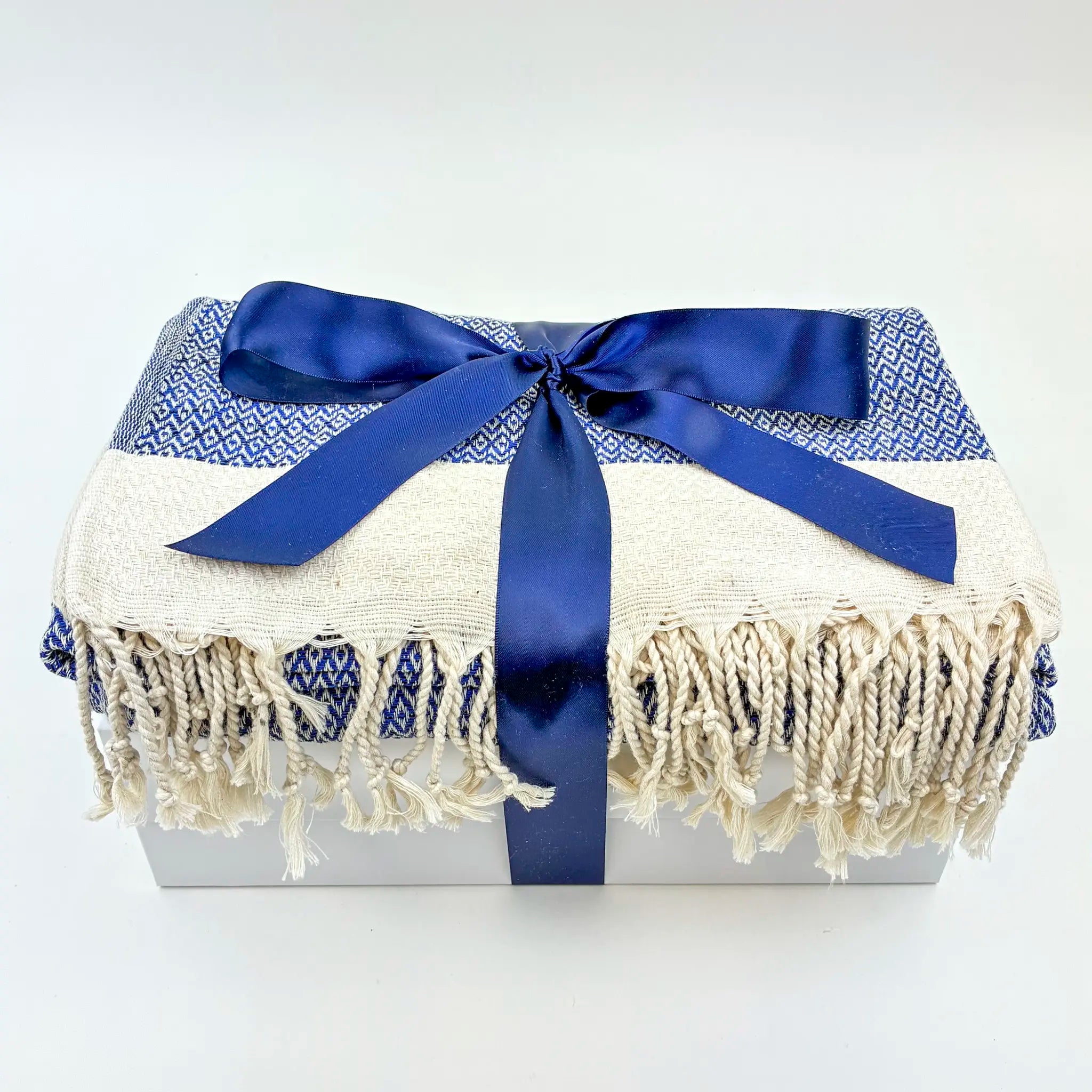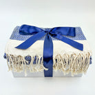 Blanket is placed on top of the gift box and tied with a navy blue ribbon. Makes a great first impresstion.