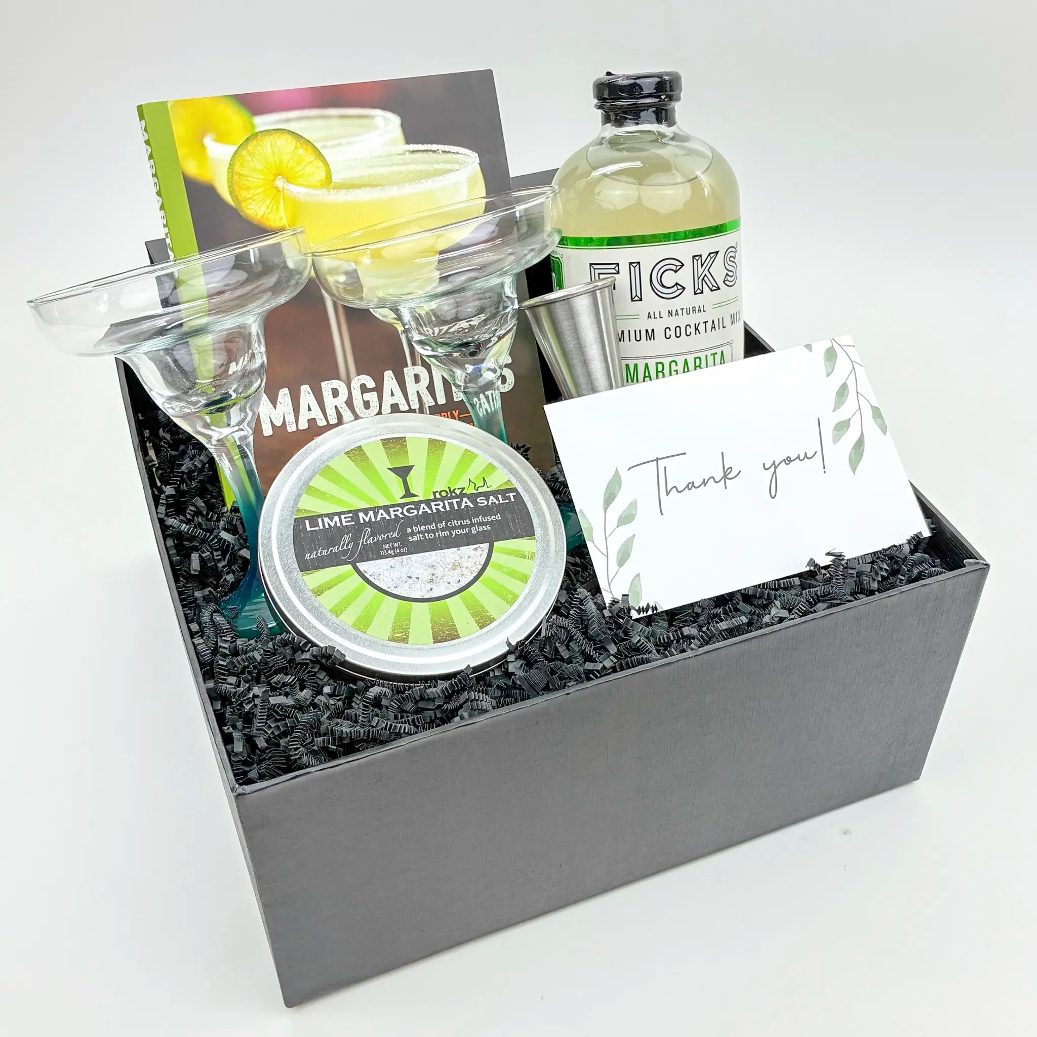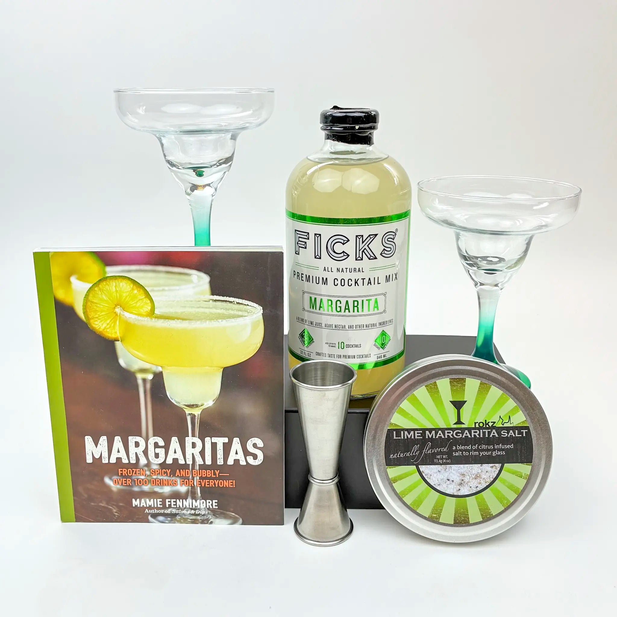 A festive margarita gift featuring two personalized green stemmed glasses, premium margarita mix, lime rim salt, a stainless steel jigger, and the Margaritas cocktail book—perfect for client celebrations and memorable team toasts.