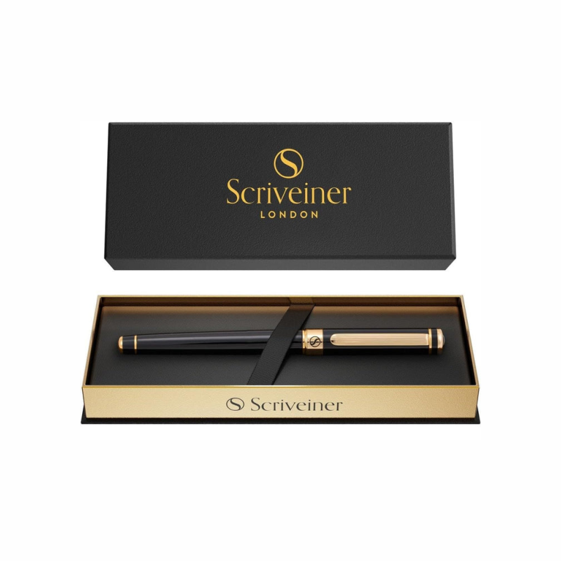 A stunning luxury rollerball pen by Scriveiner. Brass with jet-black lacquer finished in 24 karat gold. Premium quality and understated luxury from a boutique British brand.