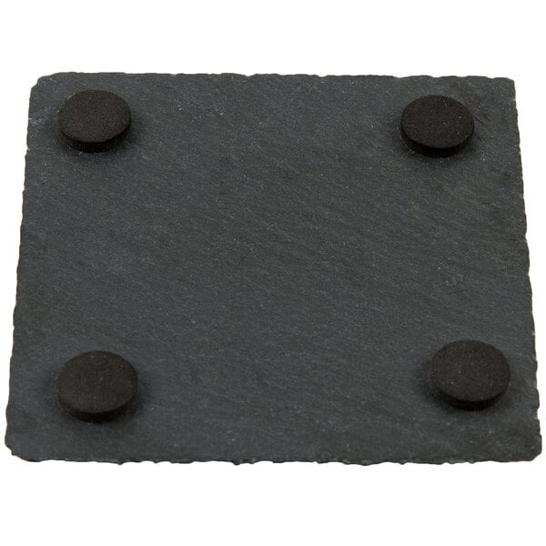 Four (4" x 4") natural slate coasters with rubber feet to protect furniture.